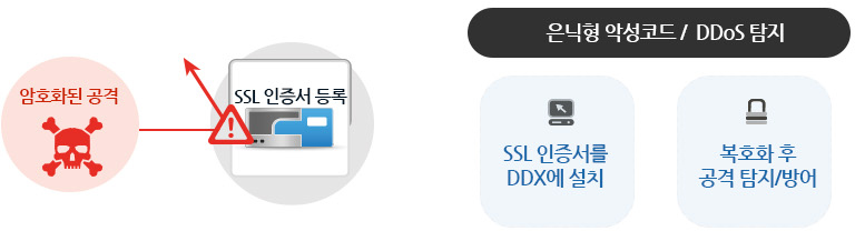 다양하고 복합적으로 발생되는 지능화된 DDoS 공격을 행동기반과 시그니처 기반의 탐지·방어 기법으로 차단합니다.