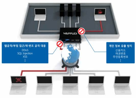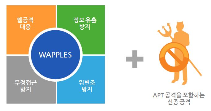 WAPPLES는 웹 공격 유형 별로 공격을 분석하여 탐지하는 로직 분석 기반의 지능형 웹방화벽으로 국내 최초 ICSA Labs 웹 애플리케이션 방화벽(WAF) 인증 및 PCI-DSS v3.1 준수 보증을 획득한 제품입니다.